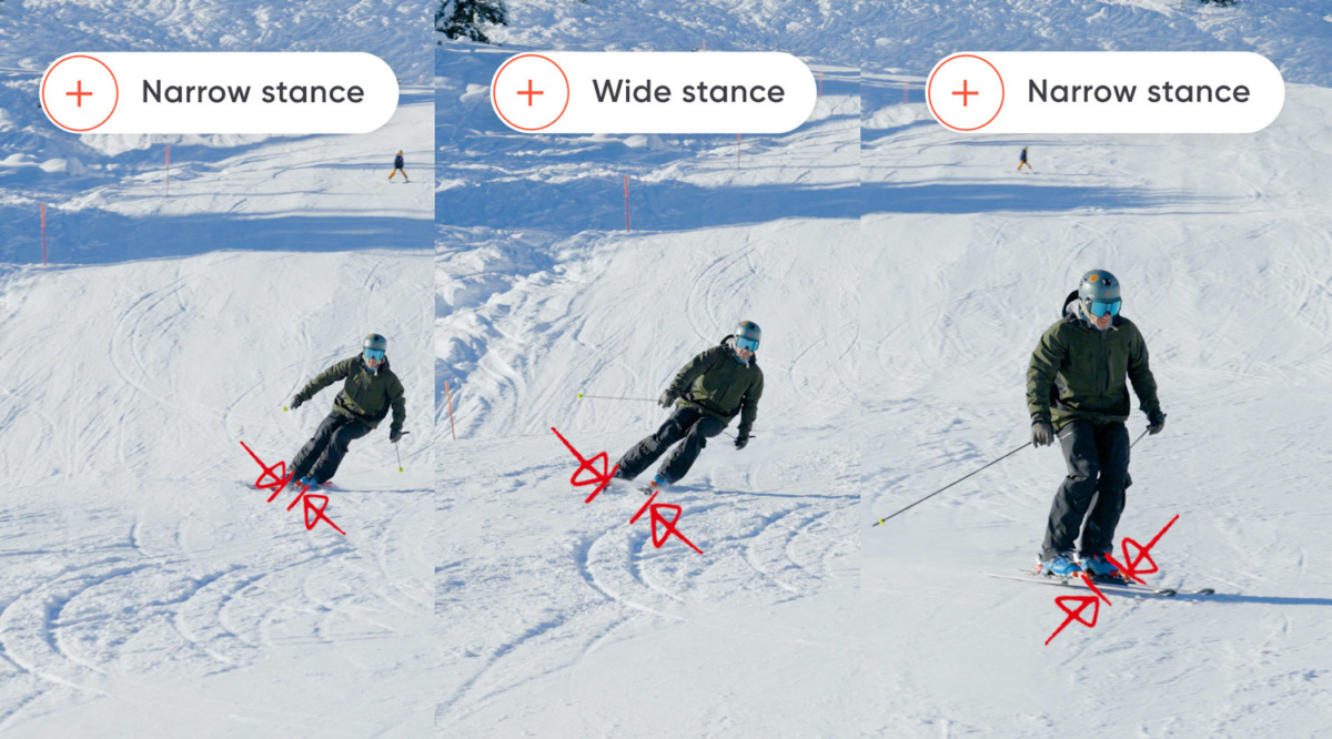Intermediate skiers often find it difficult to keep this consistent, so the distance between their skis will widen and shorten as they move between turns.