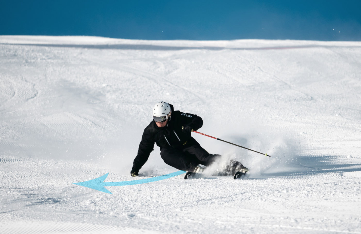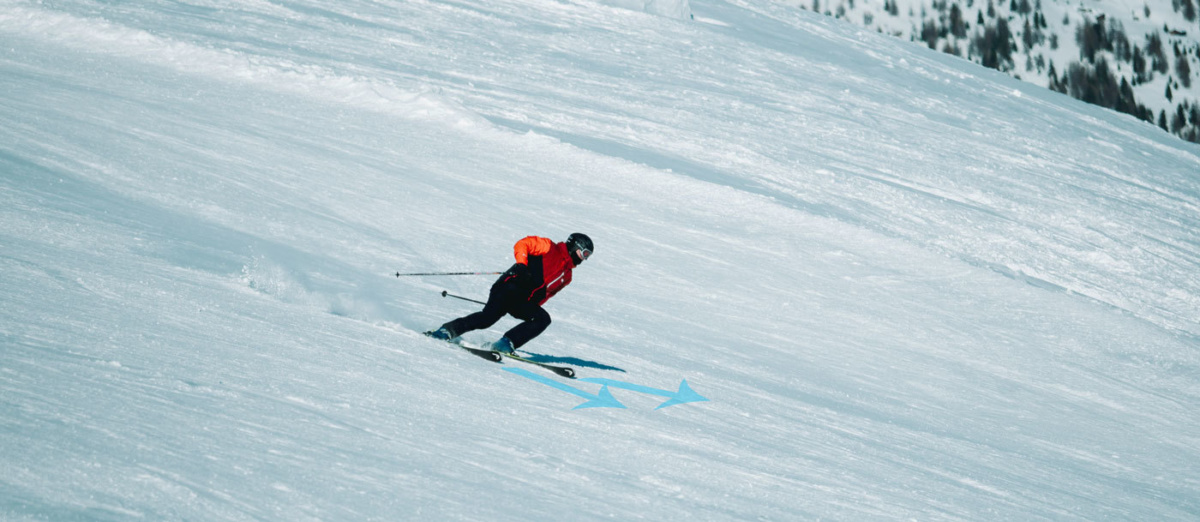 A carved turn is where the ski is bent against its natural camber into an arc, and that arc shape guides the skis along a curved path. Modern skis are already shaped to make this easier. When carving, the tail of the ski follows the same path of the tip; meaning almost no resistance from the snow, and leaves a clean pencil line track in the surface of the piste. A carving ski will move faster and build more pressure, so you feel higher g-forces than in any other turn, which is why it’s the best technique for racing. It is also why it feels so good!