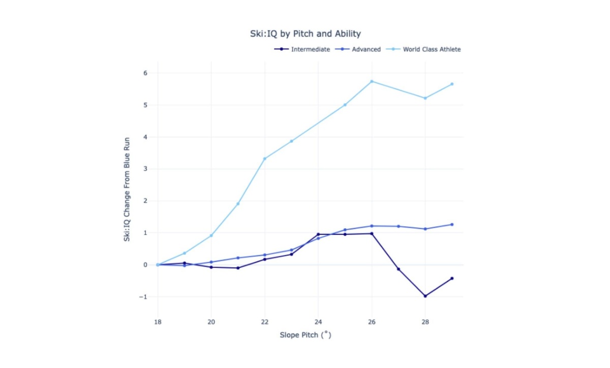 Figure: Intermediate skiers are able to achieve relatively flat Ski:IQ values until higher pitch where they fall off. Advanced skiers are able to achieve modest increases in Ski:IQ across higher pitch values. World-class athletes are more rewarded for great technique in higher pitch.