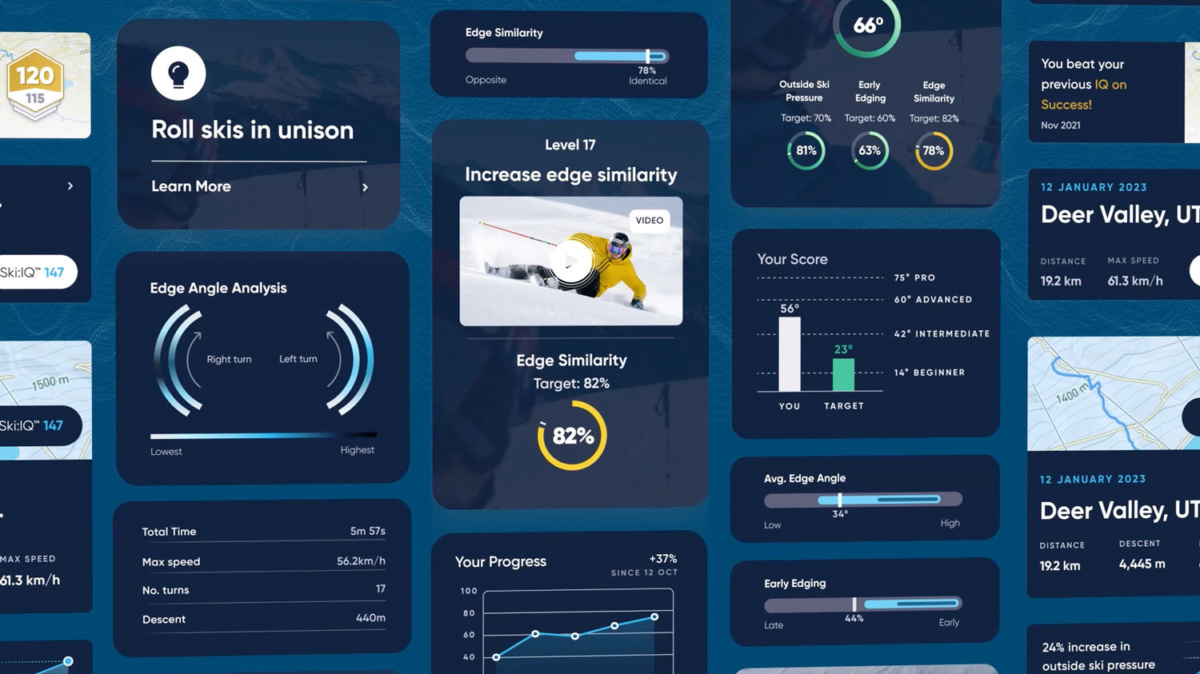 The progressive edge metric (new for 2023) measures how you roll your skis throughout the turn - rewarding advanced skiers who hold a tight arc for longer.