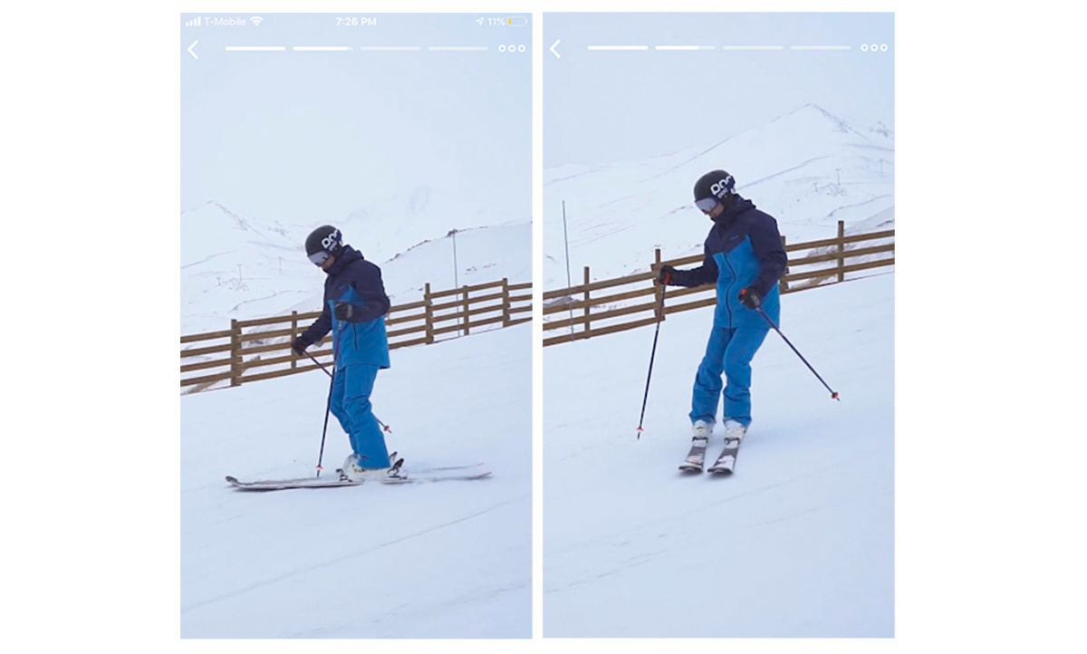 After the storm and with only three full days left to ski I decided to focus on one training drill, edging. Honestly, I had no clue as to how I was actually supposed to use the edges of my skis for turning. I chose the drill called “Pivot Slips”. The Carv app now provides visual coaching segments per drill (see pics below of the instructor making left to right 180 degree pivots). I did this drill for the next three days.