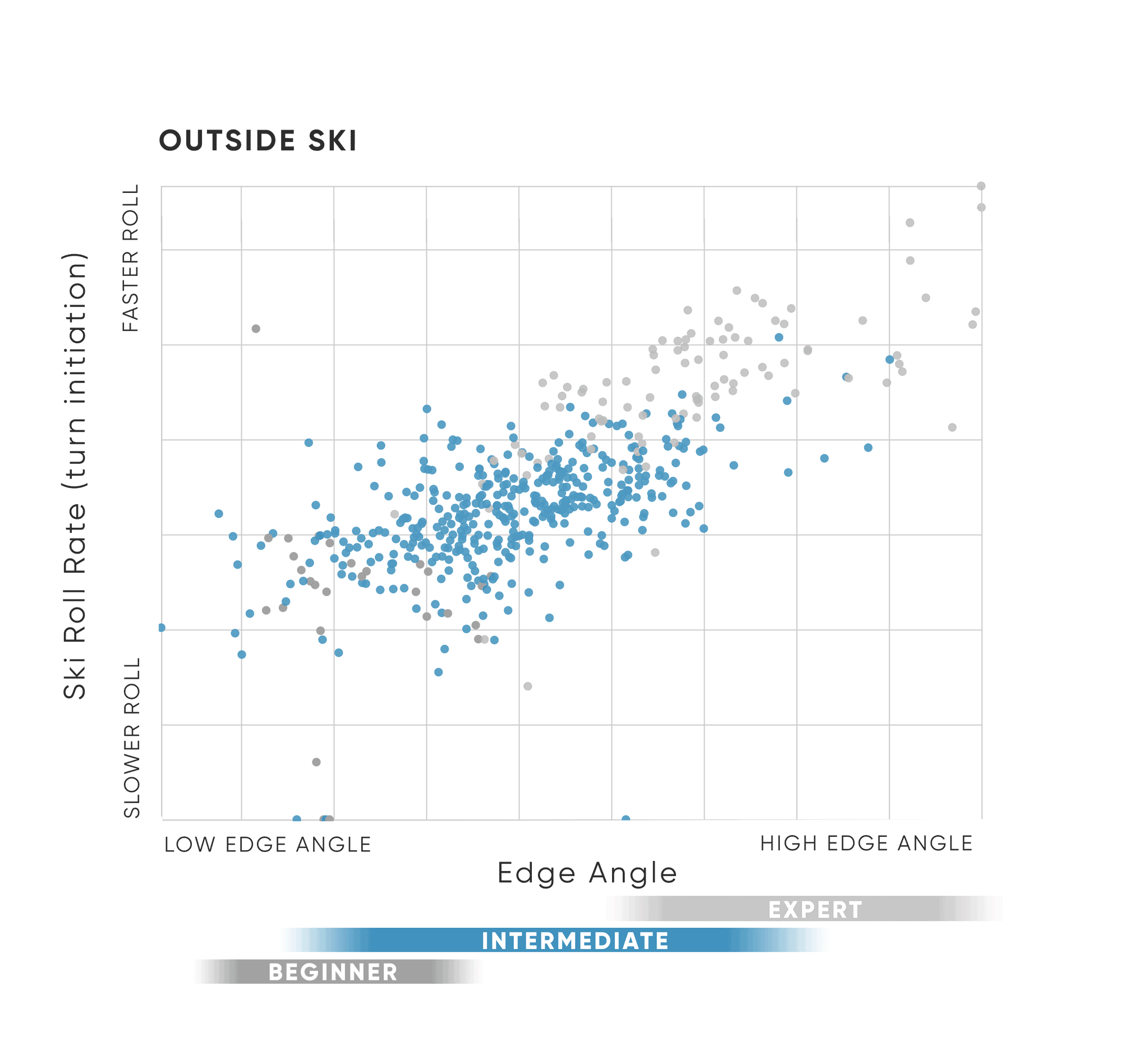 Intermediates roll their skis at different rates (the blue dots are more spread out and lower for the inside ski)